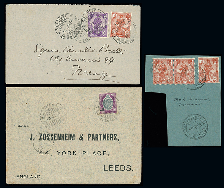 1381 c, entire, etc. imageMalta: Italian Mailboats: 1907 printed envelope to Leeds franked K.E.VII 3d. tied by “ETRURIA/PIROSCAFI POSTALE ITALIANO” double ring c.d.s. with additional strike at left, 1924 envelope to Florence franked 1d. and 11/2d. and a piece franked 11/2d. (3) tied by similar cancellations for the “SOLUNTO” and “TOLEMAIDE”, the first Ex Clough. (3 items) (Image1)