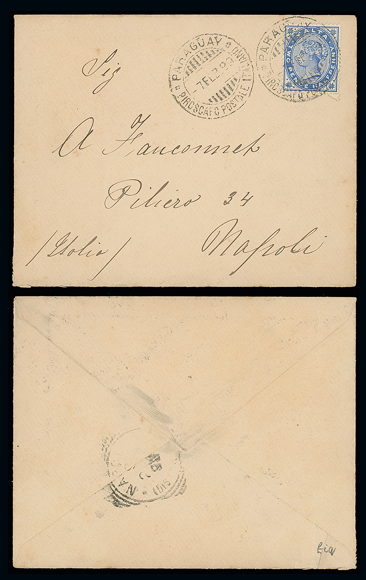 1380 c, entire, etc. imageMalta: Italian Mailboats: 1899 (Feb. 7 and Sept. 12) envelopes to Rome or Naples franked 21/2d. tied by Italian packet “ASIA/PIROSCAFI POST./ITALIANI” or “PARAGUAY” double ring c.d.s. with additional strikes at left also a similar example on a piece for the “PERSIA”. (3 items) (Image1)
