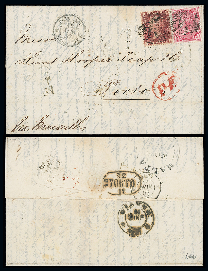 Malta: M Cancellations: Covers: 1857 (Nov. 9) entire letter “via Marseilles” to Oporto franked 1857 1d. and 1857 4d. rose tied by barred “M” cancellations for the 1/4oz. to frontier rate with oval “PF” mark on red