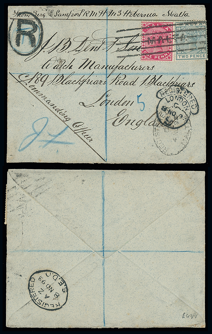 1885 1d. carmine and 2d. grey (slightly over the edge of the cover) tied by “MALTA” straight line bar cancellation with oval “R” mark at top left and Malta and London registration datestamps. The only example of registered military concession rate