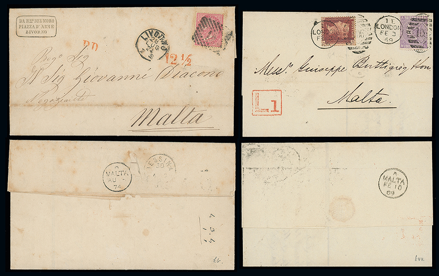 and 1874 (July 28) entire letter (toned) to Malta franked Italy 40c. tied by a numeral cancellation with Livorno c.d.s., “P.D.” and “121/2” accountancy marks in red and with Messina and Malta c.d.s’s on reverse. (2) Photo. (Image1)