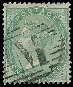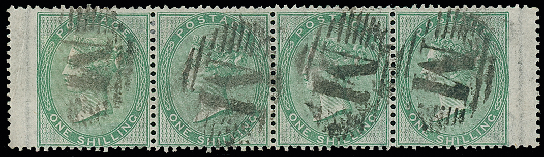 Malta: M Cancellations: 1856 1s. green, in a horizontal strip of four, used, a few blunted perfs., otherwise fine. S.G. Z22. Photo. (Image1)