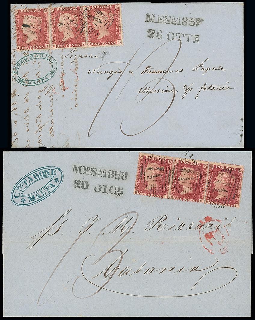 Malta: M Cancellations: Covers: 1857 (Oct. 10) wrapper to Messina and 1858 (Dec. 18) wrapper to Catania each franked 1857 1d. strip of three plates 27 (incl. gothic “K” on “QK”) or plate 57 (incl. BJ with
