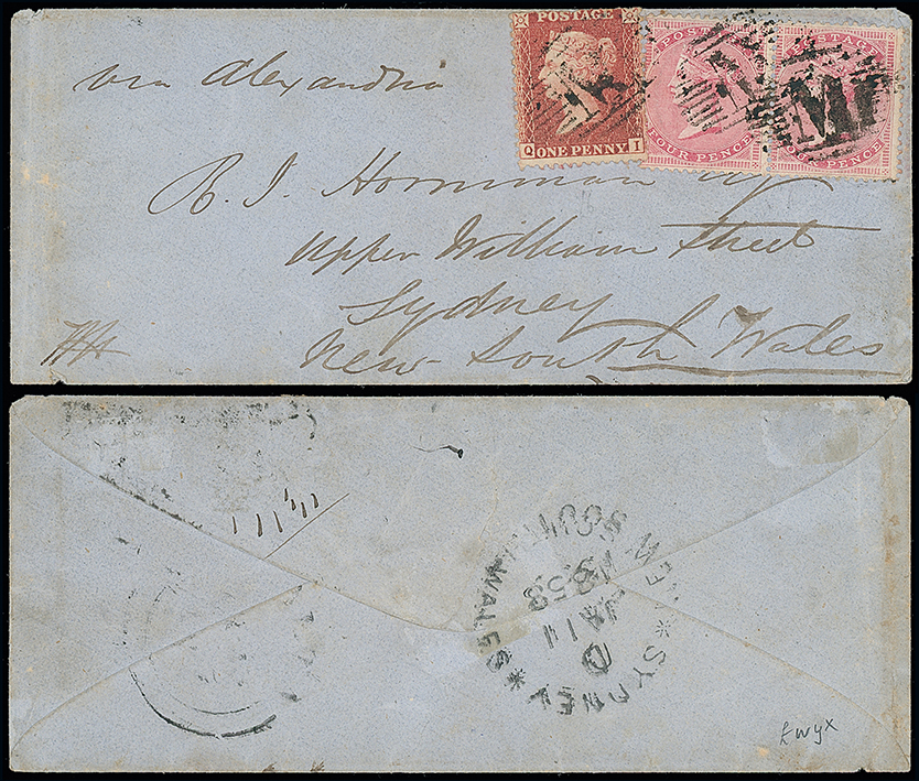 Malta: M Cancellations: Covers: 1857 (Nov.?) envelope “via Alexandria” to Sydney, New South Wales franked 1857 1d. and 1857 4d. pair tied by barred “M” cancellations apparently franked for a letter to G.B. (as the