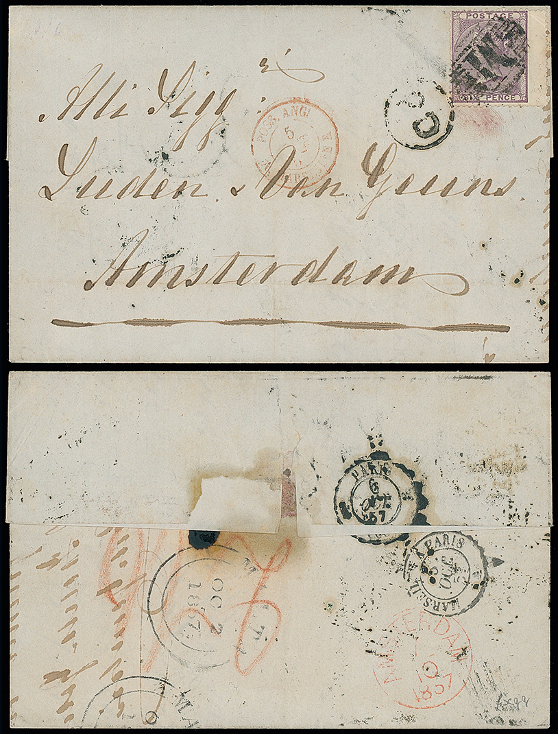 Malta: M Cancellations: Covers: 1857 (Oct. 2) reduced entire letter to Amsterdam franked 1856 6d. tied by barred “M” cancellation and circular “PD” and with Marseille transit c.d.s. Malta, Paris and Amsterdam