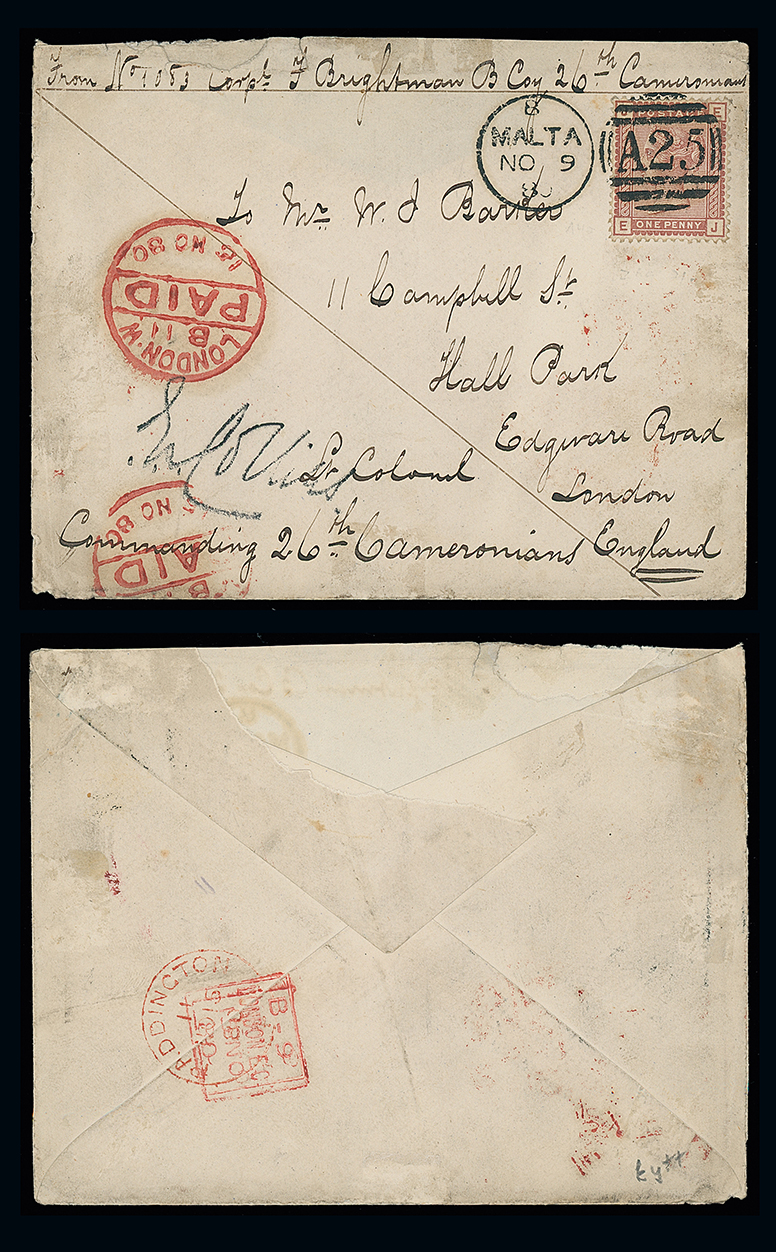Malta: Army and Navy Concession Rate Mail: 1880 (Nov. 9) envelope (a few faults) to London franked 1d. Venetian red tied by “A25” duplex, endorsed “From No. 1083 Corpl F. Brightman B Coy 26th Cameronians” and