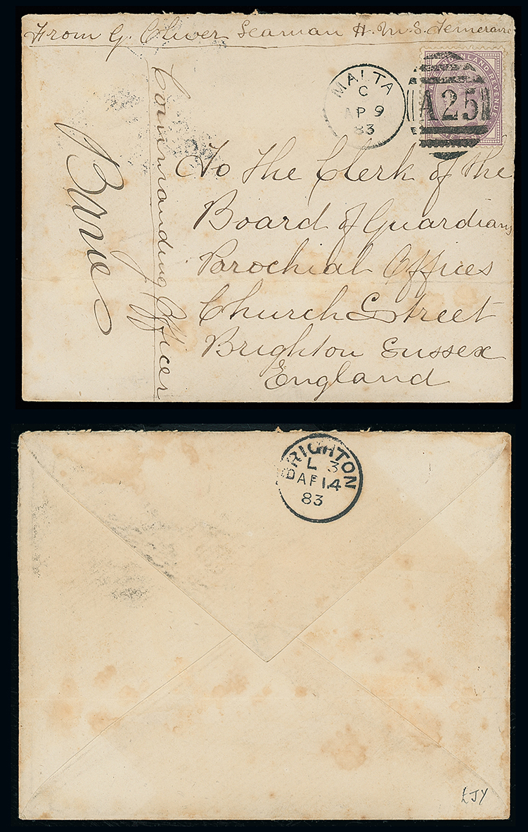 Malta: Army and Navy Concession Rate Mail: 1883 (Apr. 9) envelope (minor stains) to Brighton endorsed “From G. Oliver Seaman H.M.S Temeraire” and countersigned by commanding officer at left, franked 1881 1d. lilac