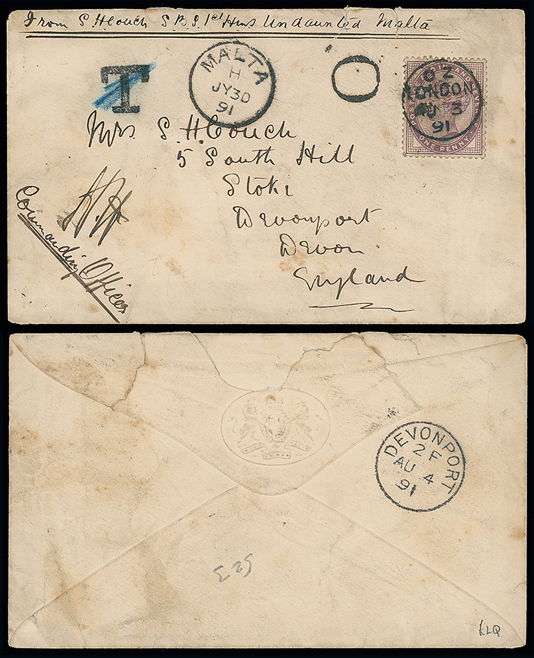 Malta: Army and Navy Concession Rate Mail: 1891 (July 30) envelope to Devonport endorsed “From S.H. Couch S.B.S. 1st H.M.S Undaunted Malta” countersigned by commanding officer at left with Malta c.d.s. and franked