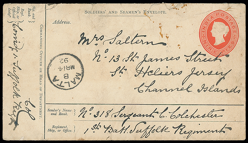 Malta: Army and Navy Concession Rate Mail: 1892 (Mar. 14) 9p. India embossed “SOLDIERS AND SEAMAN’S ENVELOPE” to Jersey with Malta c.d.s. at left and indicia uncancelled endorsed by a Sergeant of the 1st Battalion