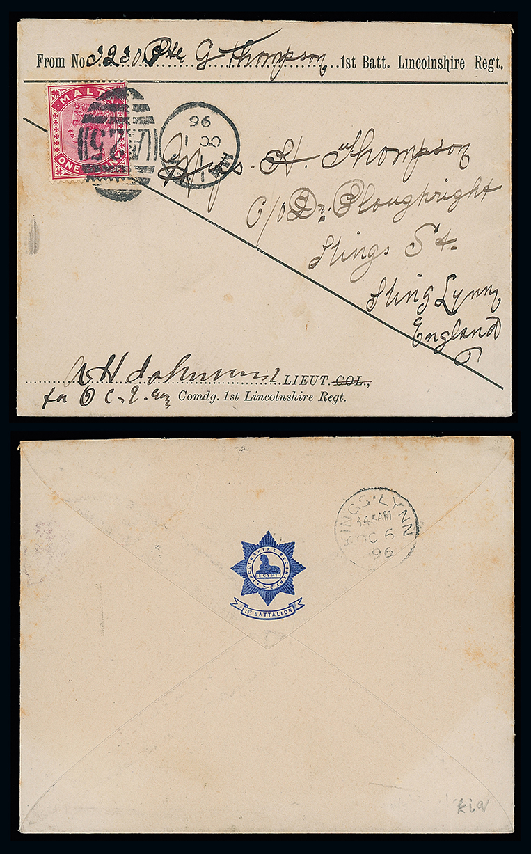 Malta: Army and Navy Concession Rate Mail: 1896 (Oct. 1) printed “1st Batt. Lincolnshire Regt” envelope to England franked 1885 1d. carmine tied by “A25” duplex, endorsed and countersigned by commanding officer