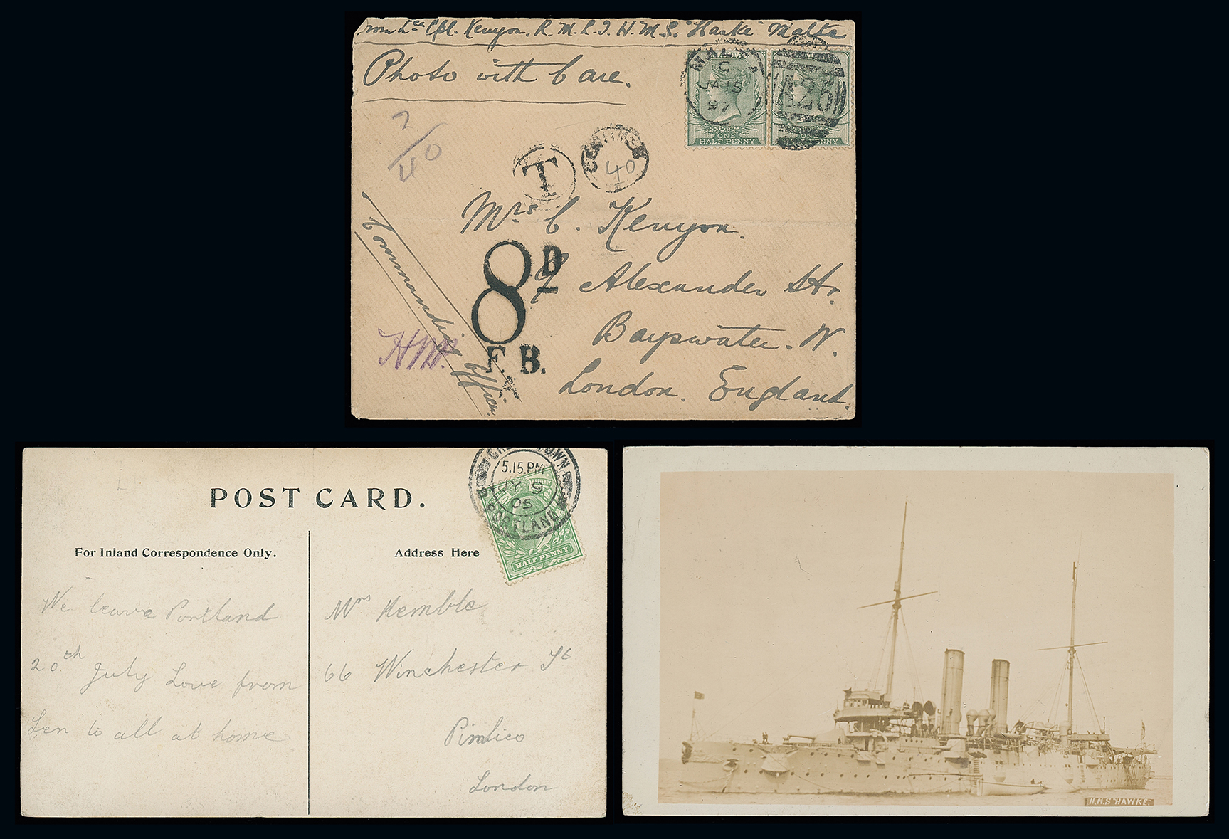 real-photographic postcard of the ship sent from Portland in 1905. “Hawke” was an early victim in World War I, torpedoed and sunk in the North Sea on Oct. 15 1914 by German submarine U-9. (2 items) Ex Disraeli, Eastgate and Swarbrick. Photo. (Image1)