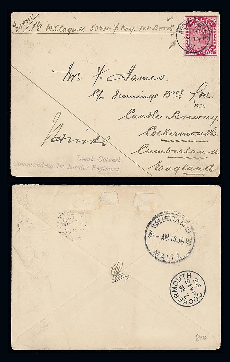 Malta: Army and Navy Concession Rate Mail: 1898 (Jan. 13) envelope to England franked 1885 1d. carmine tied by Notabile c.d.s., endorsed “From Pte W.Clague, 5324, F Coy 1st Borders Regiment” and countersigned by