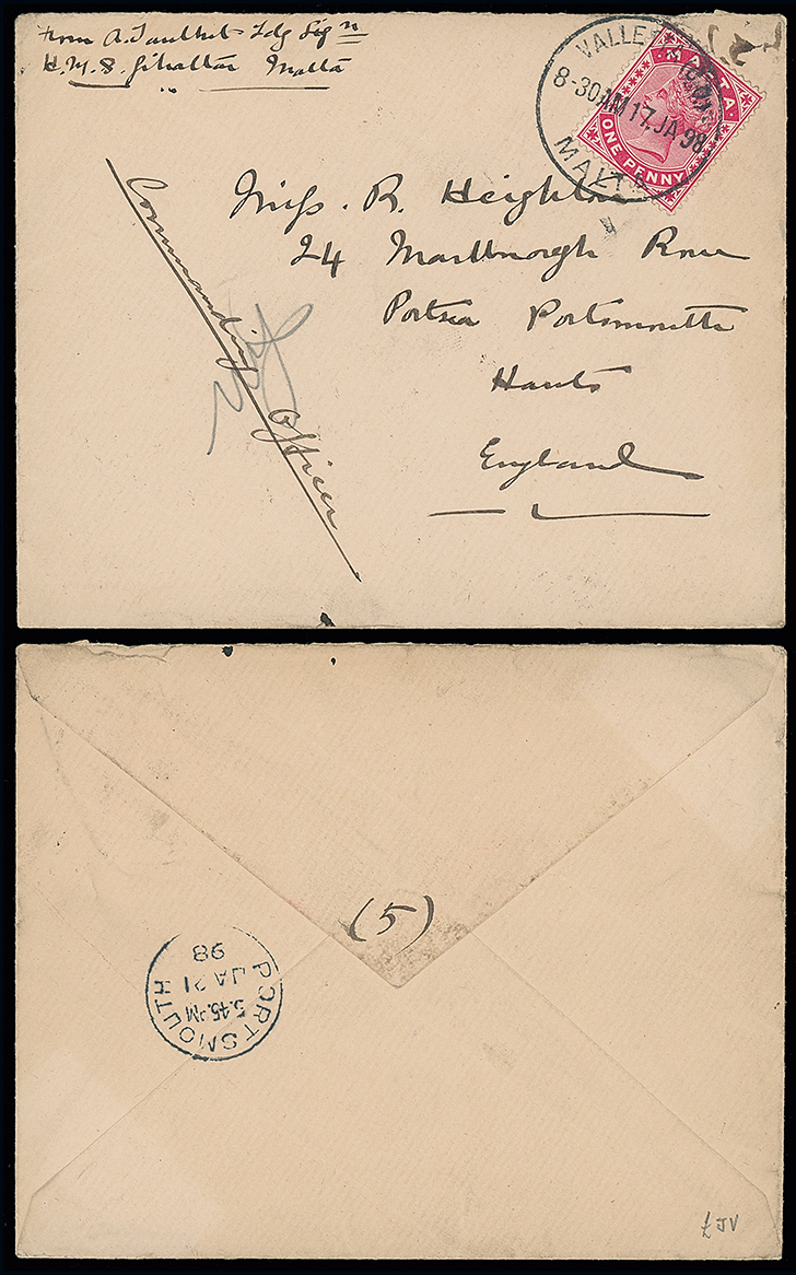 Malta: Army and Navy Concession Rate Mail: 1898 (Jan. 17) envelope to Portsmouth endorsed “From A. Taulbet Ldg Sign/H.M.S Gibraltar Malta” and countersigned by commanding officer at lower left, franked 1885 1d.