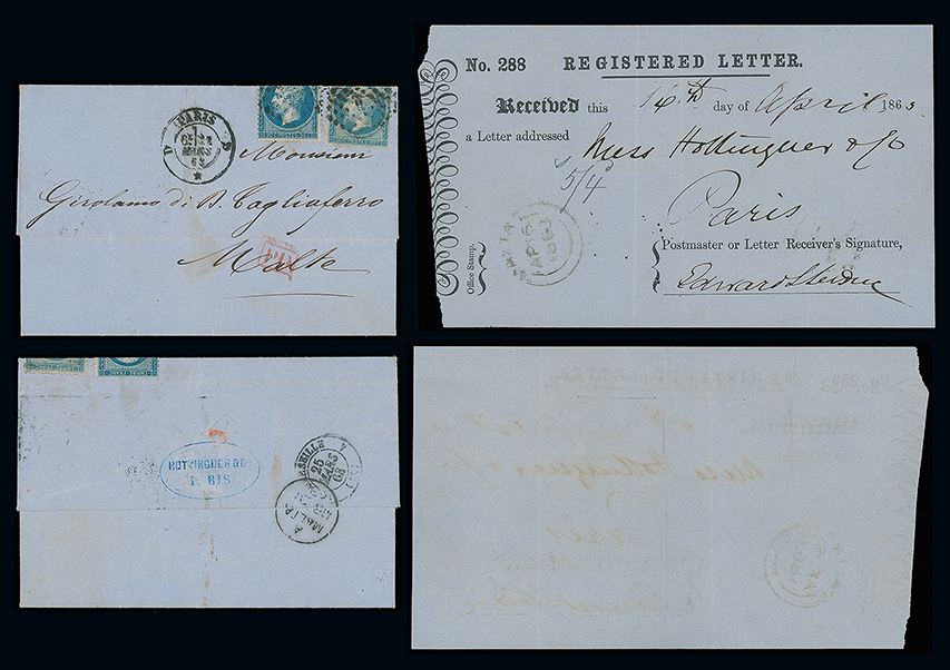 Malta: Incoming Mail: 1863 (Mar. 22) entire to Malta from Paris franked France 20c. (2) with Marseille and Malta c.d.s. on the reverse and with a 1863 (Apr. 16) printed “REGISTERED LETTER” receipt for a letter,