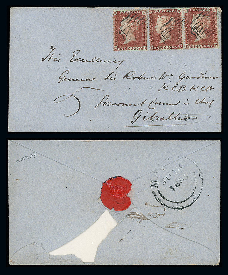 Gibraltar. The cover is in the hand of Colonel Arthur Taylor of the Royal Artillery at Sevastopol and is addressed to Major General Sir Robert Gardiner, Governor of Gibraltar. Illustrated in “Stamp Collecting” (Oct. 23 1975) following its discovery.