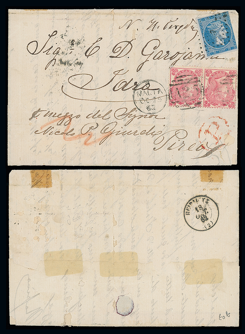 1556 c, entire, etc. imageMalta: A25 Cancellations: Covers: 1864 (Dec. 17) entire letter (fragile address panel) to Idra franked 1862 3d. tied by A25 duplex, rated “20” lepta due with Greece 1861 10l. vertical pair alongside tied by Idra c.d.s. and partially over an oval “P.” mark in red. Piraeus datestamp on the reverse. Photo. (Image1)
