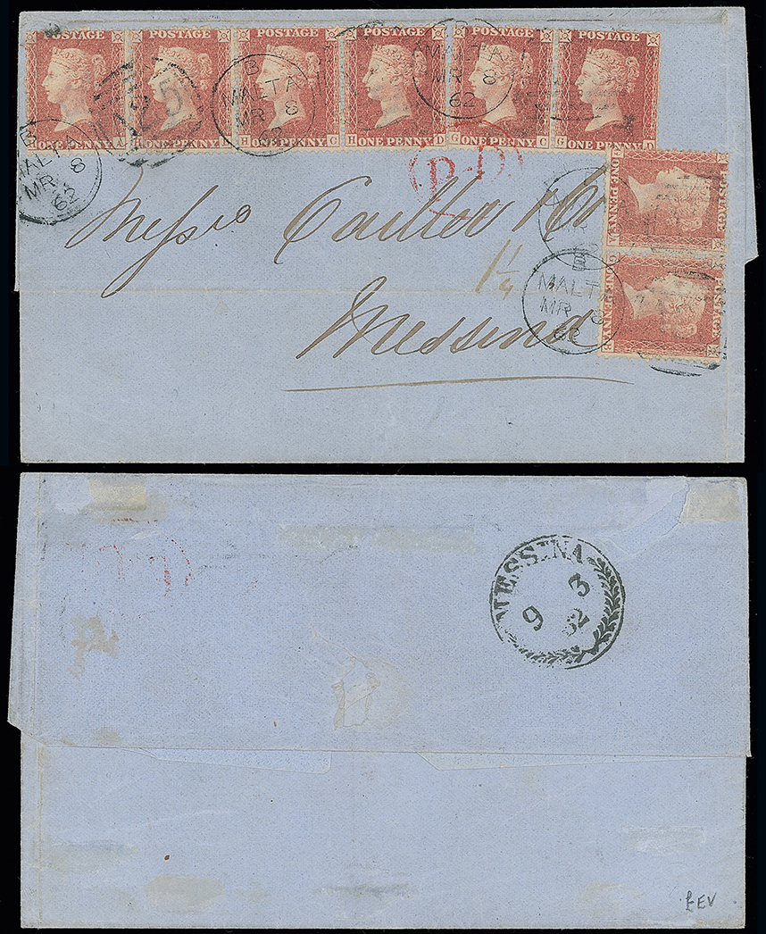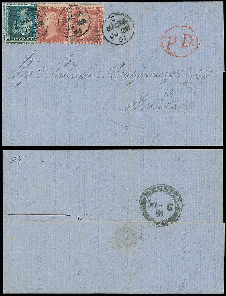 1544 c, entire, etc. imageMalta: A25 Cancellations: Covers: 1861 (June 28) entire letter to Messina franked 1857 1d. pair and 2d. plate 8 tied by three strikes of the “MALTA” c.d.s. (code “C”) in lieu of the “A25” duplex and unusual, red oval “P.D.” mark at right and with Messina arrival c.d.s. on the reverse. Photo. (Image1)