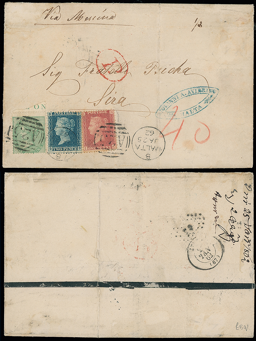 1545 c, entire, etc. imageMalta: A25 Cancellations: Covers: 1862 (Jan. 25) mourning entire letter “via Messina” to Syra franked 1857 1d., 1861 2d. plate 9 and 1856 1s. tied by two “A25” duplexes with oval red “P.” mark and “40” lepta charge mark, Syra arrival c.d.s. on the reverse, very scarce quintuple rate to Greece, mostly fine. Photo. (Image1)