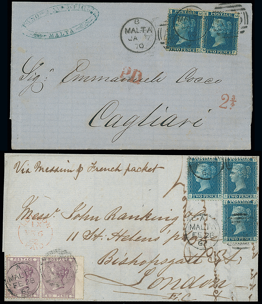 1546 c, entire, etc. imageMalta: A25 Cancellations: Covers: 1862 (Feb. 26) entire letter “via Messina p French Packet” to London with unusual franked 1858 2d. plate 9 block of three and 1856 6d. pair (wing margin) tied by “A25” duplexes with London Paid c.d.s. and 1870 (Jan. 7) entire letter to Cagliari franked 1858 2d. pair 13 tied by “A25” duplex with red “P.D.” and “23/4” accountancy marks in red. (2) Photo. (Image1)