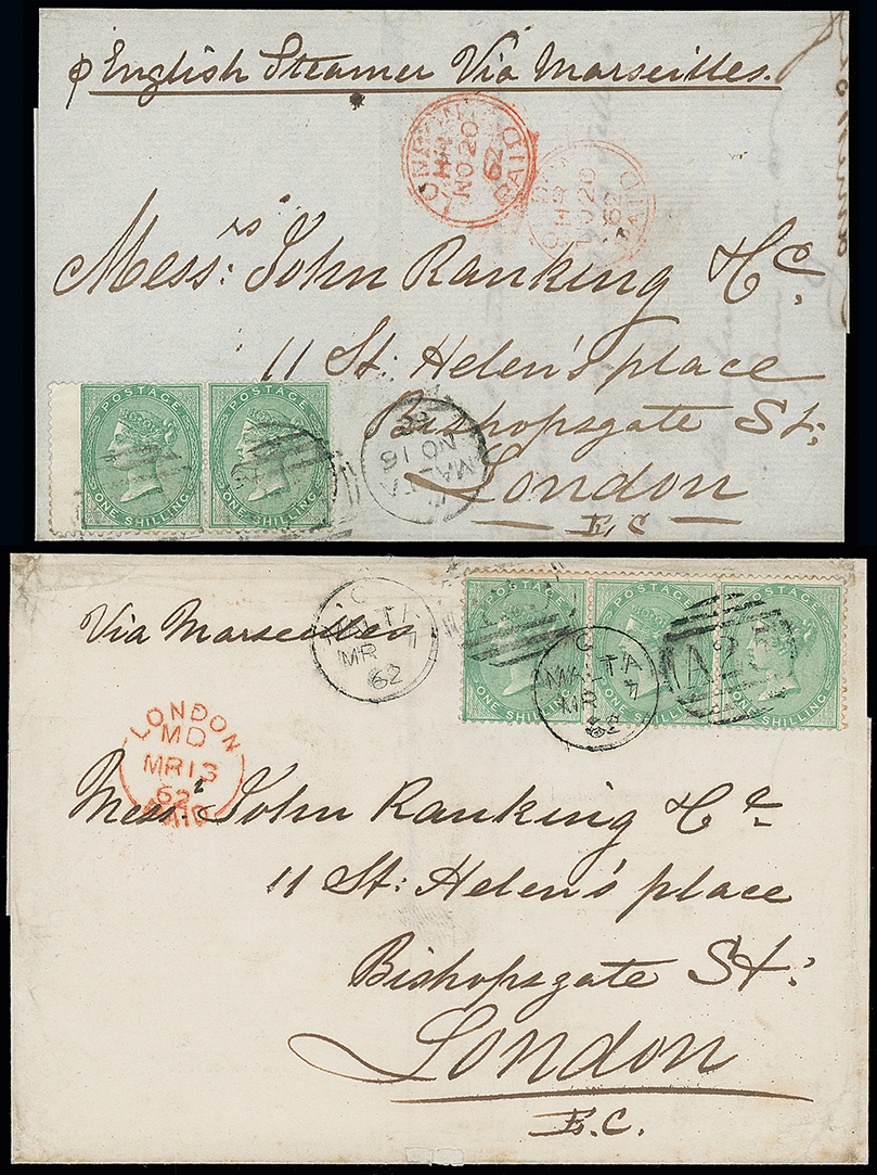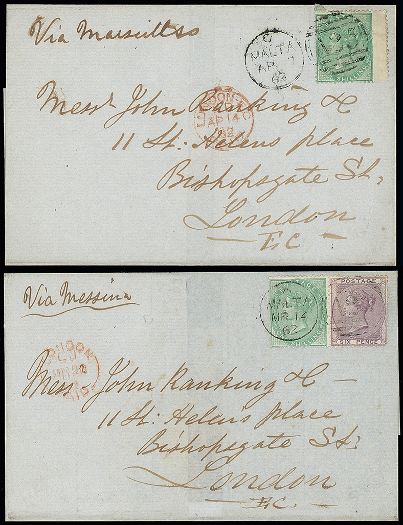 1549 c, entire, etc. imageMalta: A25 Cancellations: Covers: 1862 (Mar. 14, Apr. 7) wrappers “via Messina” or “via Marseilles” to the same addressee in London franked 1856 1s. and 6d. or 1856 1s. tied by “A25” duplexes and with London Paid single arc c.d.s., the former carried by the French Packets “Capitole” to Messina and “Gange” to Marseille, very fine pair showing double and triple rates. Photo. (Image1)