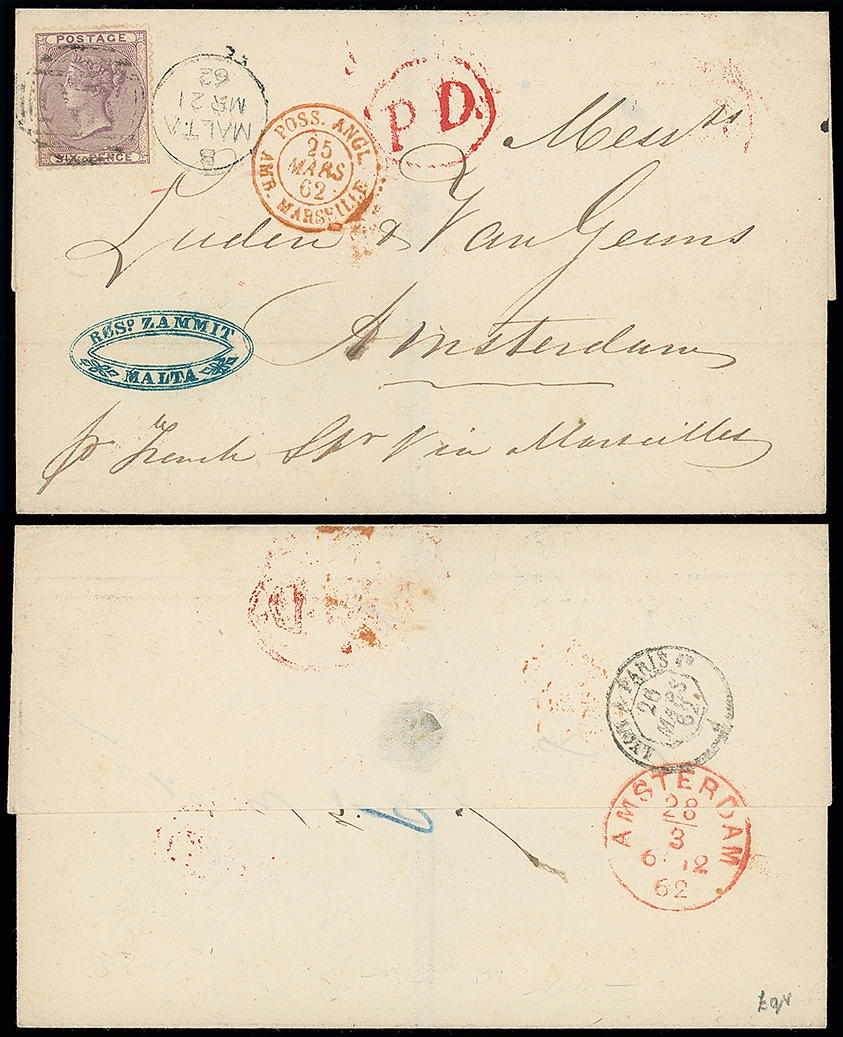 1550 c, entire, etc. imageMalta: A25 Cancellations: Covers: 1862 (Mar. 21) wrapper “pr French Steamer via Marseilles” to Amsterdam franked 1856 6d. tied by “A25” duplex with red oval “P-D.” mark and Marseille transit c.d.s. Lyon-Paris T.P.O. and Amsterdam arrival c.d.s. on the reverse, uncommon destination. Photo. (Image1)