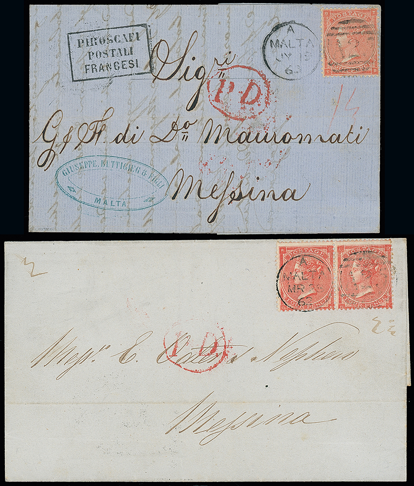 1551 c, entire, etc. imageMalta: A25 Cancellations: Covers: 1862 (Mar. 28) entire letter to Messina franked 1862 4d. pair plate 3 tied by “A25” duplex with oval red “P-D.” mark and 1863 (July 19) entire letter to Messina franked 4d. plate 3 tied by “A25” duplex with oval red “P-D.” mark and framed “PIROSCAFI/POSTALI/FRANCESI” mark. (2) Photo. (Image1)