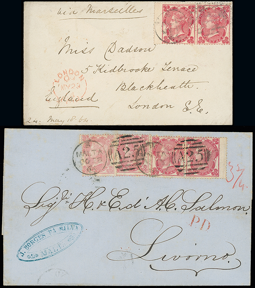 1547 c, entire, etc. imageMalta: A25 Cancellations: Covers: 1862 (Mar. 7, Nov. 20) wrappers to London both endorsed “via Marseilles” and franked 1856 1s. strip of three or wing margin pair tied by “A25” duplex with London Paid arc or double ring arrival c.d.s., fine. (2) Photo. (Image1)