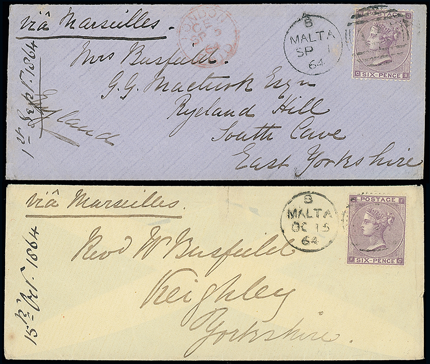 1555 c, entire, etc. imageMalta: A25 Cancellations: Covers: 1864 (Sept. 1, Oct. 15) envelopes “via Marseilles” to the same addressee in Yorkshire franked 1862 6d. plates 3 or 4 tied by “A25” duplex, London transit and Keighley arrival datestamps, fine. (2) Photo. (Image1)
