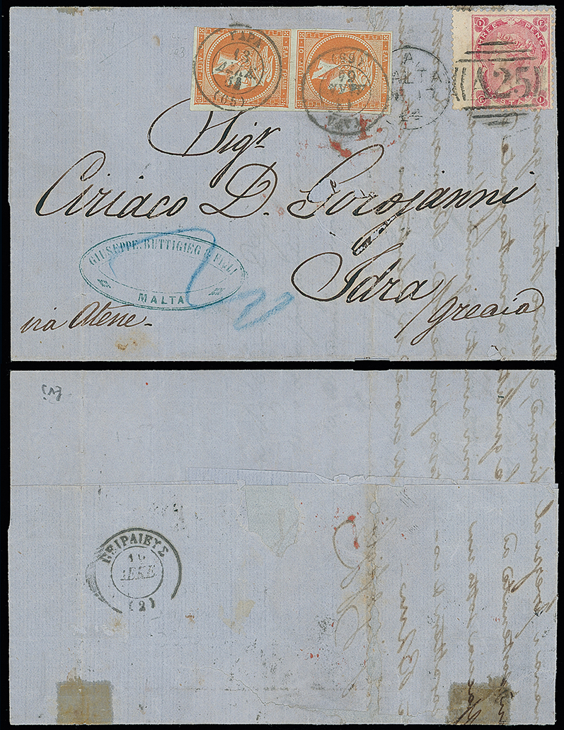 1552 c, entire, etc. imageMalta: A25 Cancellations: Covers: 1862 (Oct. 25) entire letter to Piraeus franked 1862 3d. pair tied by A25 duplex, rated ‘20’ lepta due with Greece 1861 20l. affixed to top right and tied by “2” (Piraeus) lozenge cancellations with oval “P.” mark in red and Piraeus arrival datestamp on the reverse, attractive cover. Photo. (Image1)