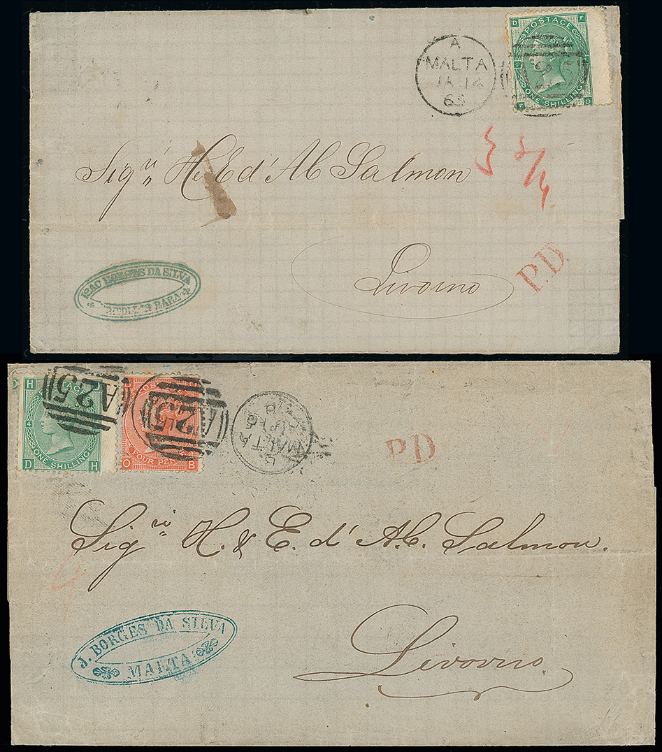1557 c, entire, etc. imageMalta: A25 Cancellations: Covers: 1865 (Jan. 14) entire letter to Livorno franked 1862 1s. (wing margin) for the triple rate and tied by “A25” cancellation and “P.D.” mark, ex Francisco and 1870 (Aug. 10) entire letter to Livorno franked 1870 4d. plate 12 and 1867 1s. plate 4 for the quadruple rate tied by “A25” duplexes with red “P.D.” mark. (2) Photo. (Image1)