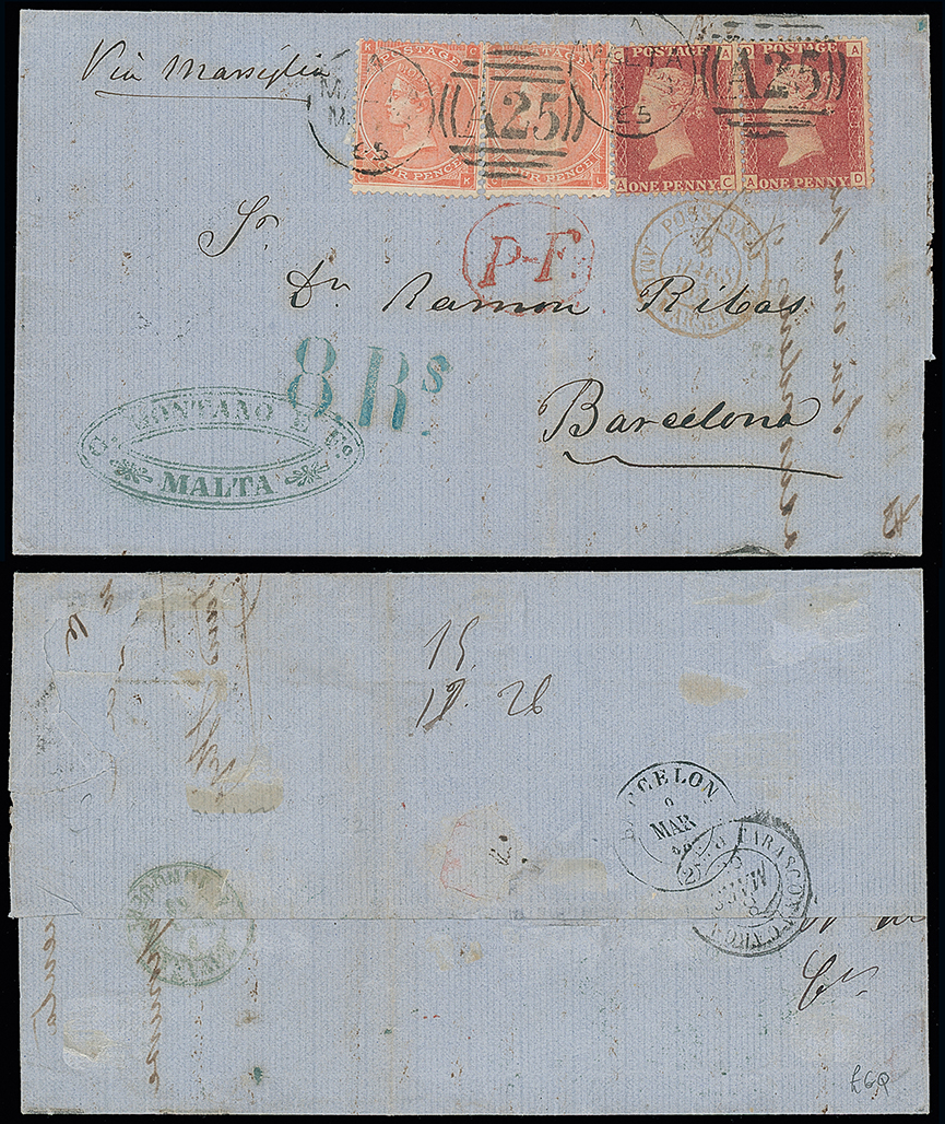 1558 c, entire, etc. imageMalta: A25 Cancellations: Covers: 1865 (Mar. 2) entire letter to Barcelona franked 1858 1d. pair plate 88 and 1862 4d. plate 4 (2) tied by “A25” duplexes with oval red “P-F”, Marseille transit c.d.s. and “8.R.s” charge mark and with French and Spanish T.P.O and Barcelona c.d.s. on the reverse, fine. Ex Coates. Photo. (Image1)