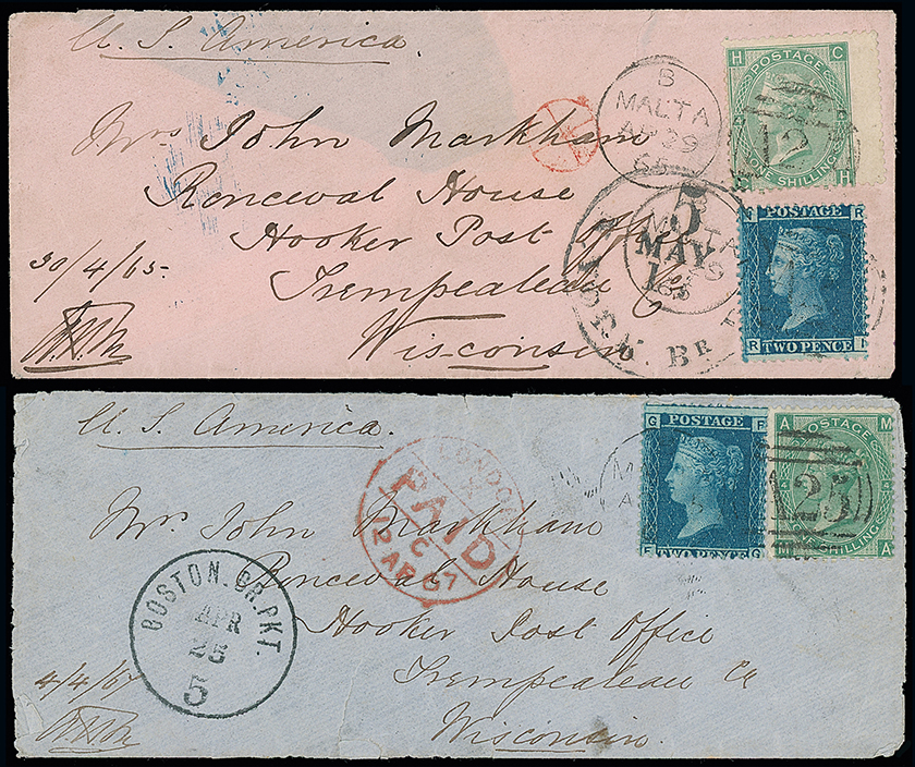 1559 c, entire, etc. imageMalta: A25 Cancellations: Covers: 1865 (Apr. 29) and 1867 (Apr. 5) envelopes (flap faults) to Wisconsin (Markham correspondence) each franked 1858 2d. plate 9 and 1865 1s. plate 4 or 1858 2d. plate 9 and 1867 1s. plate 4 all tied by “A25” duplex, with London transit c.d.s. on front or reverse and with New York or Boston Packet “5”(cents) charge datestamps, attractive pair. (2) Photo. (Image1)