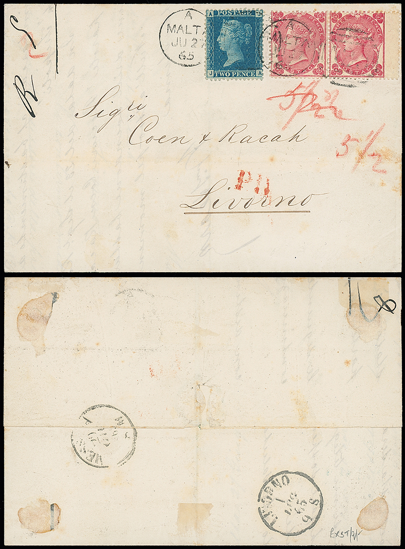 1560 c, entire, etc. imageMalta: A25 Cancellations: Covers: 1865 (June 14) entire letter to Livorno franked 1858 2d. plate 9 and 1862 3d. pair wing margin tied by “A25” duplexes with “P.D.” mark in red and manuscript “51/2” accountancy mark. R.P.S. certificate (1988). Photo. (Image1)