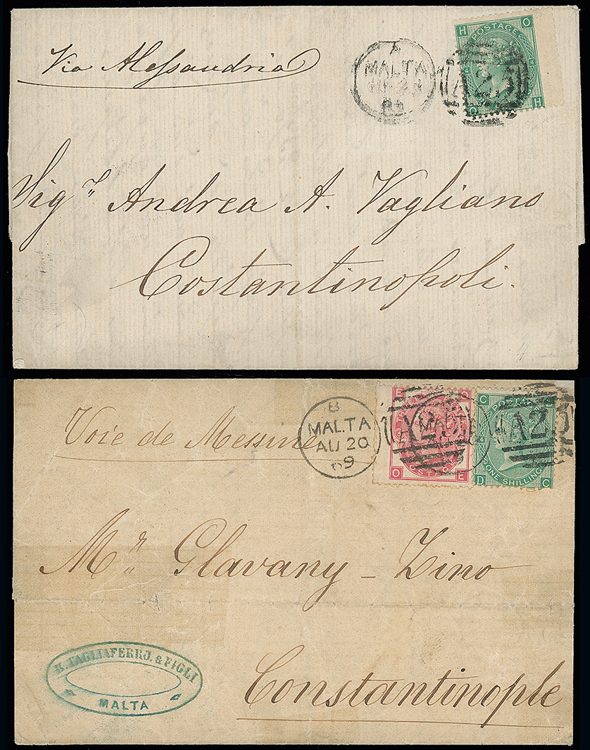1561 c, entire, etc. imageMalta: A25 Cancellations: Covers: 1865 (Oct. 22) and 1869 (Nov. 25) triple weight entire letter or wrapper (a few repairs) to Constantinople franked 1865 1s. plates 4 or 1867 3d. plate 5 and 1869 1s. plate 4 tied by “A25” duplexes and representing the change in rates from 4d. or 5d. per 1/4oz. with British P.O. in Constantinople arrival c.d.s’s on the reverse. (2) Photo. (Image1)