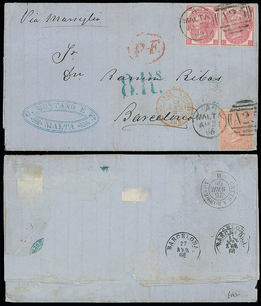 1563 c, entire, etc. imageMalta: A25 Cancellations: Covers: 1866 (Apr. 22) entire letter “via Marsiglia” to Barcelona franked 1865 3d. pair and 4d. plate 7 tied by “A25” duplexes with oval “P-F” mark, Marseille transit c.d.s. and “8.Rs.” charge mark. French and Spanish T.P.O. or transit marks and Barcelona arrival c.d.s. on the reverse, very fine and very scarce destination. Photo. (Image1)