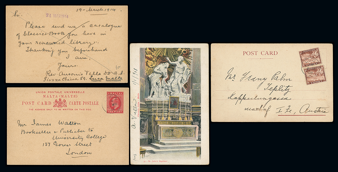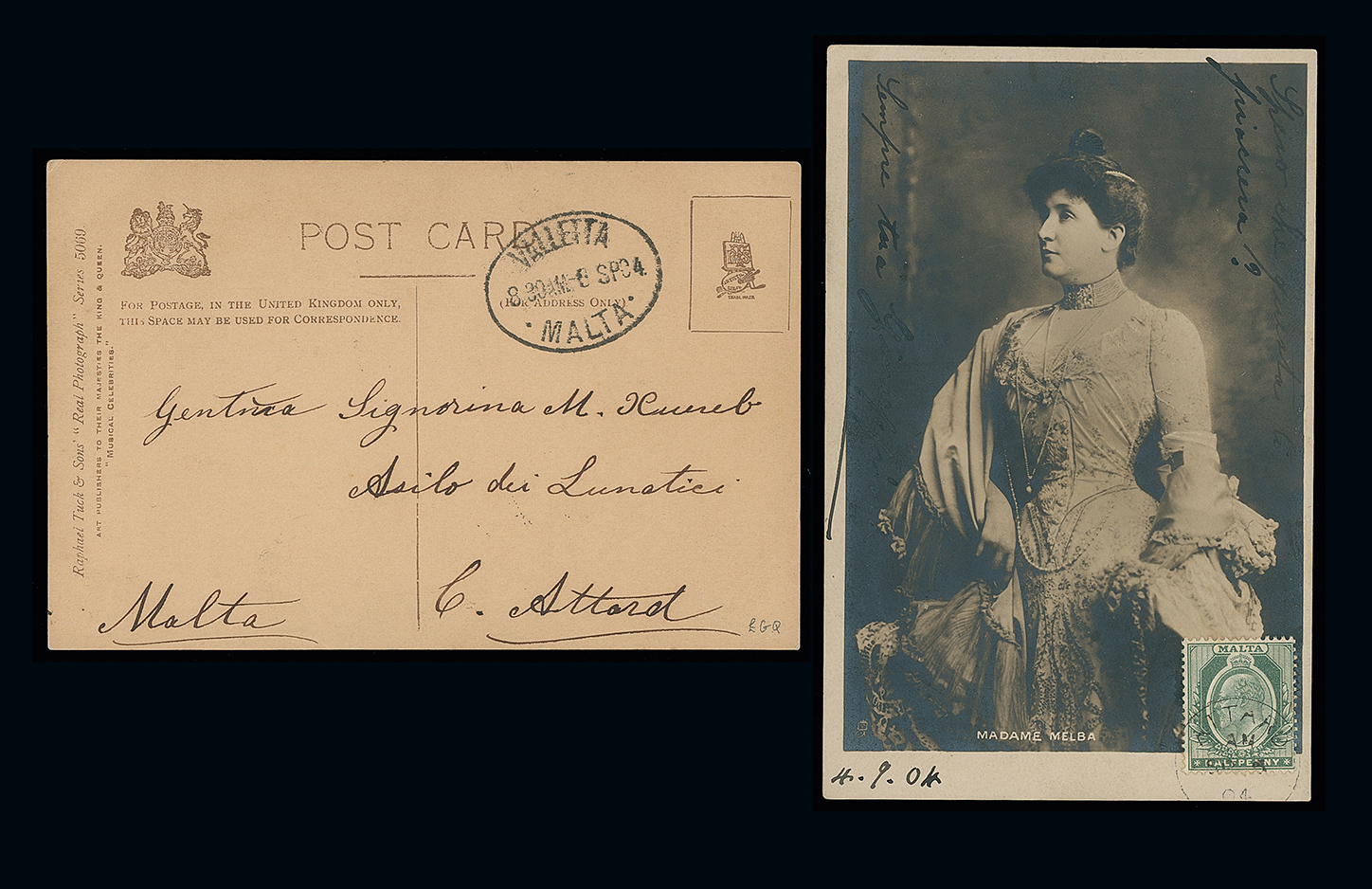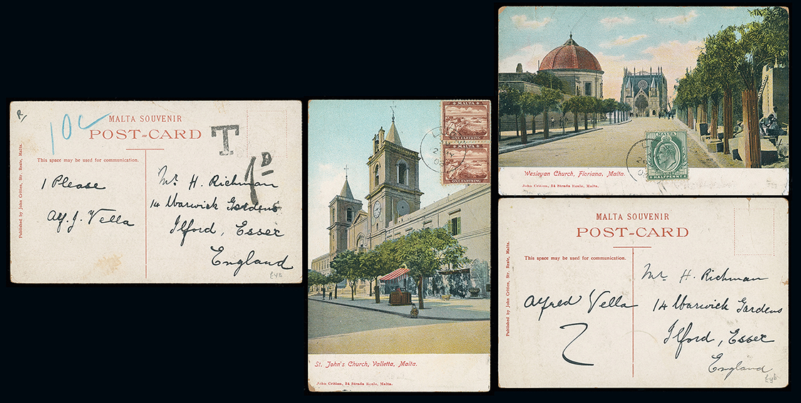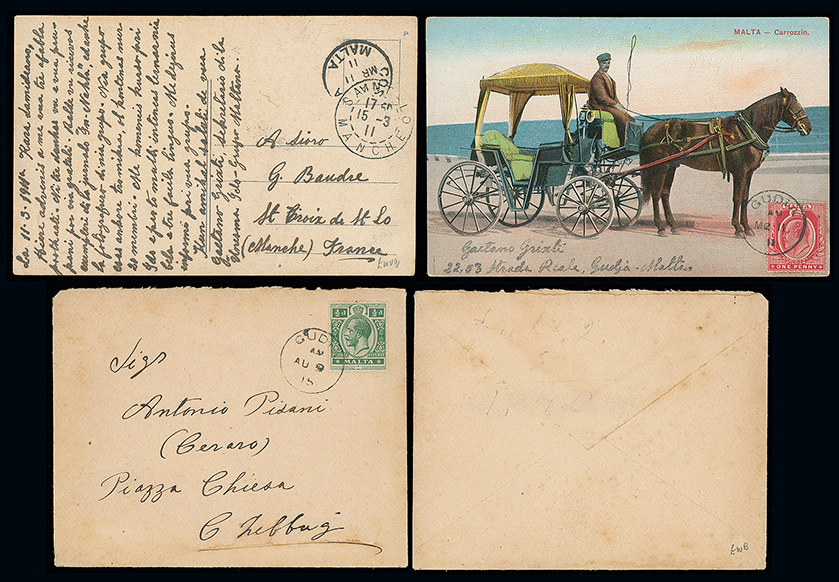 1718 c, entire, etc. imageMalta: Village Cancellations: Malta: Gudia: 1911 (Mar. 11) picture postcard to France franked 1d. and 1915 (Aug. 9) envelope to Zebugg franked 1d. both tied by “GUDIA/AM” c.d.s., very rare. (2) Photo. (Image1)