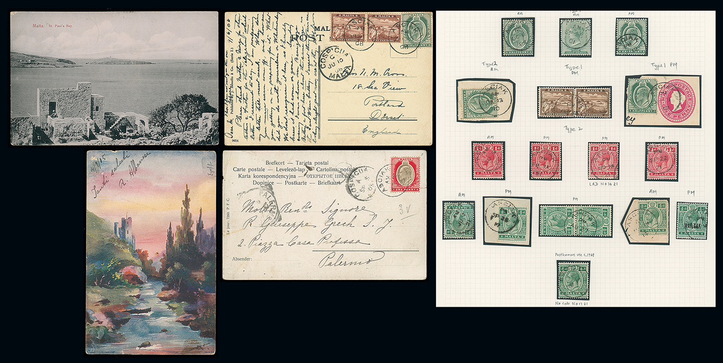 1710 c, entire, etc. imageMalta: Village Cancellations: Malta: Asciak: 1905 (Sept. 5) and 1908 (June 10) picture postcards to Palermo or England franked 1d. or 1/4d. pair and 1/2d. tied by “ASCIAK” “AM” or “PM” c.d.s. and both with Cospicua transit c.d.s, also Q,V. to K.G.V stamps used with Asciak c.d.s’s. (2 cards + 19 stamps) Photo. (Image1)