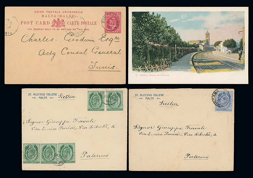 1712 c, entire, etc. imageMalta: Village Cancellations: Malta: Birchircara: 1912 (Sept. 14) 1d. postcard to Tunis with “BIRCHIRCARA/A” c.d.s. and 1914 (Feb. and May) envelopes to Palermo franked 1/2d. (5) or 21/2d. tied by “BIRCHIRCARA” c.d.s’s (codes “B”) c.d.s. also a picture postcard of the Railway Station. (4) (Image1)
