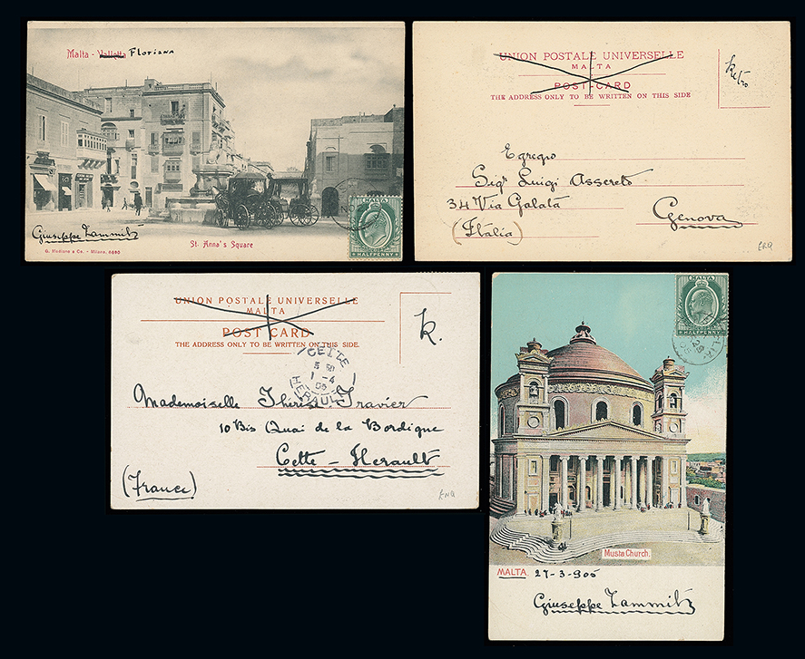 1713 c, entire, etc. imageMalta: Village Cancellations: Malta: Casal-Lia: 1903 (Mar. 28) and 1905 (Mar. 28) picture postcards to France or Italy each franked 1/2d. and tied by “CASAL-LIA/A” c.d.s’s, fine. Photo. (Image1)