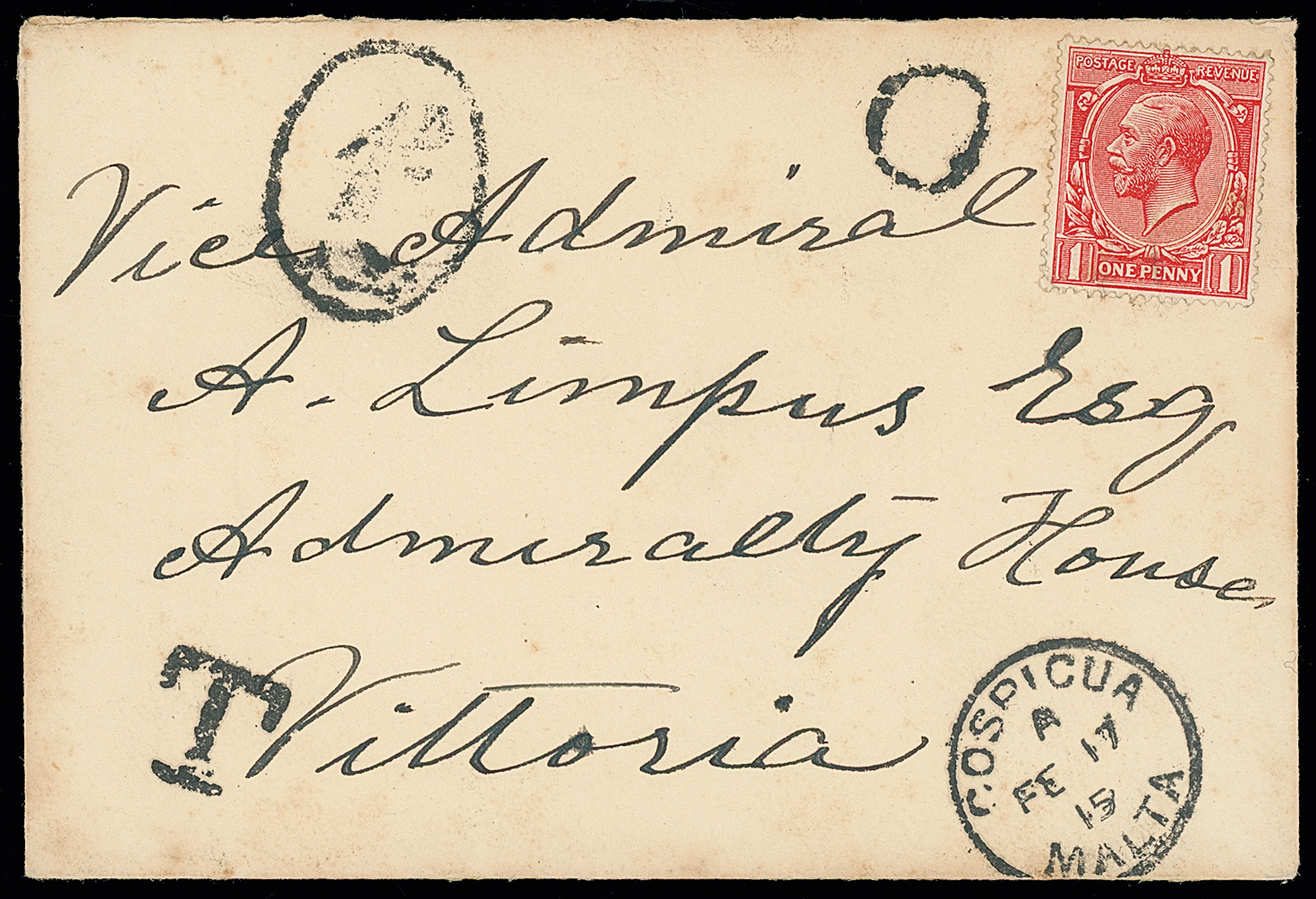 1714 c, entire, etc. imageMalta: Village Cancellations: Malta: Cospicua: 1919 (Feb. 17) envelope to Vittoria franked G.B. 1d. left uncancelled with bold “0” mark indicating zero value as franking not recognised with bold serif “T” and oval “1D/A.25” mark in black. Very rare and late use of this mark previously only recorded 1888-96. Photo. (Image1)