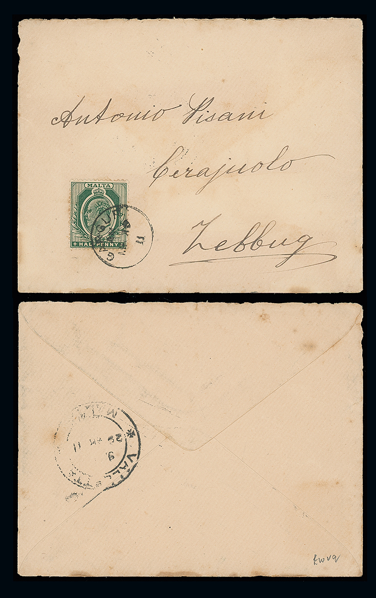 1716 c, entire, etc. imageMalta: Village Cancellations: Malta: Gargur: 1911 (Mar. 26) envelope (with contents datelined “Gargur”) to Zebbug franked 1/2d. tied by “GARGUR/AM” c.d.s., rare. Ex Eastgate. Photo. (Image1)