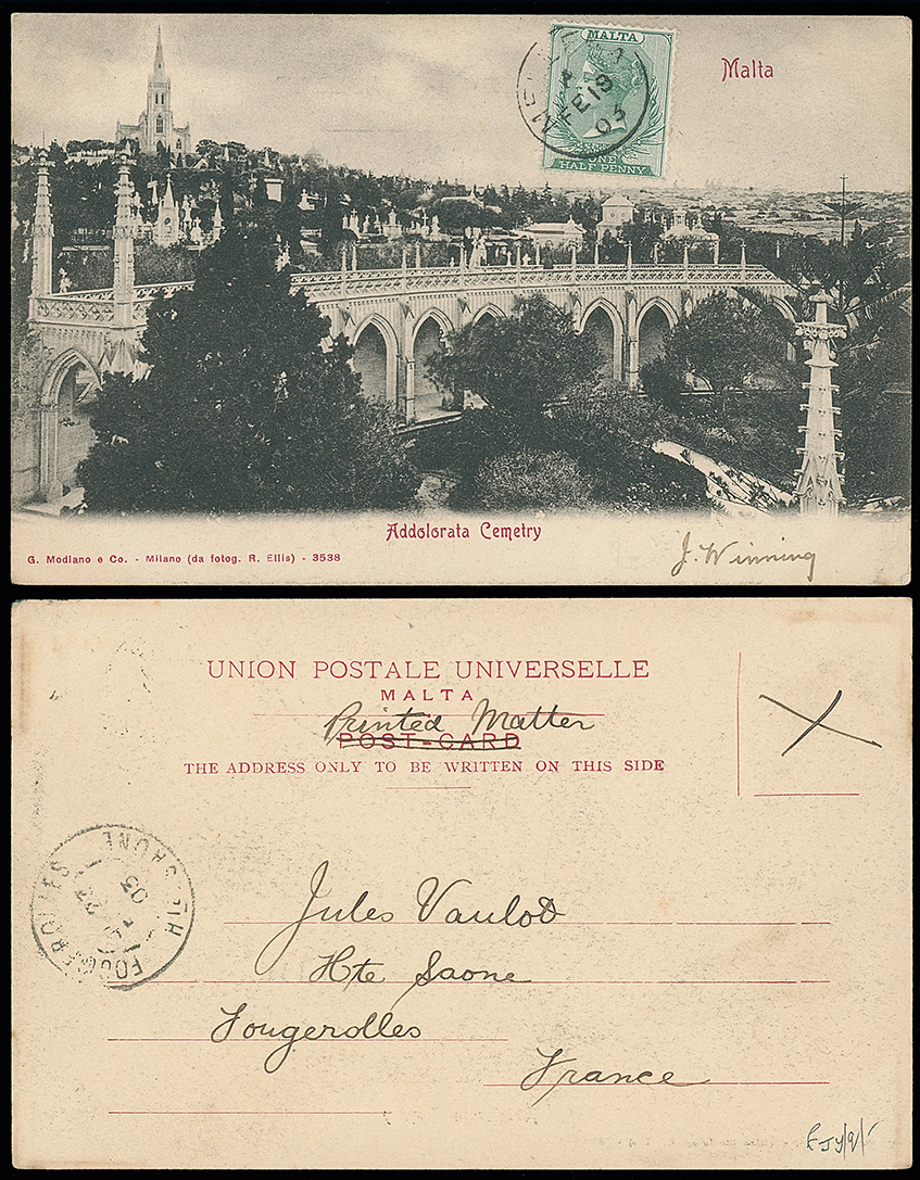 1717 c, entire, etc. imageMalta: Village Cancellations: Malta: Gudia: 1901 (Mar. 27) 1d. postcard to Paris and 1913 (Aug. 19) picture postcard to England franked 1/2d. cancelled or tied by “GUDIA/AM” c.d.s., very rare cancellations. (2) Photo. (Image1)