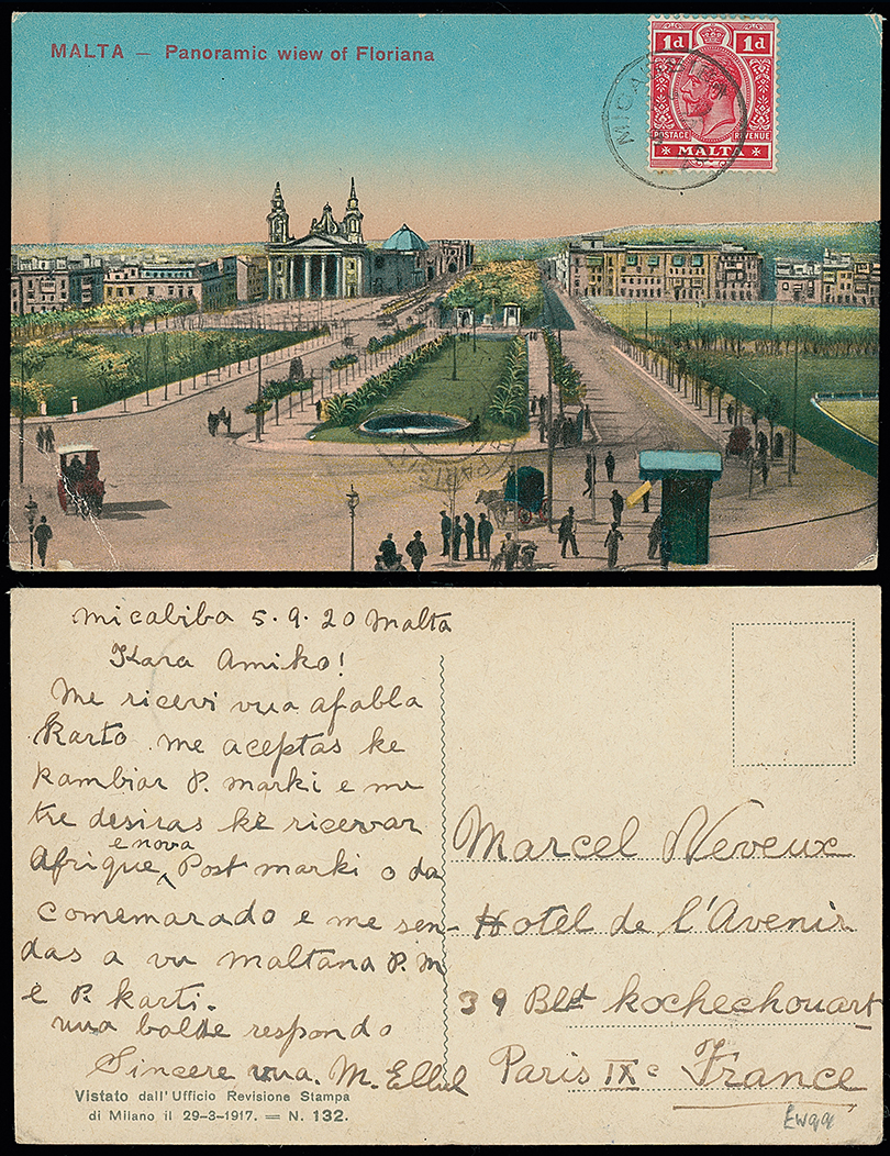 1722 c, entire, etc. imageMalta: Village Cancellations: Malta: Micabbiba: 1920 (Sept. 9) picture postcard to Paris franked 1d. (picture side) tied by very rare “MICABBIBA” (code very faint) c.d.s., very fine. Photo. (Image1)