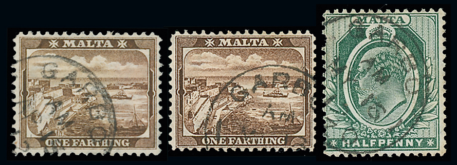 1715 Used imageMalta: Village Cancellations: Gozo: Garbo: K.E.VII 1/4d. brown (2) and 1/2d. green, used with “GARBO” c.d.s’s. (3) Photo. (Image1)