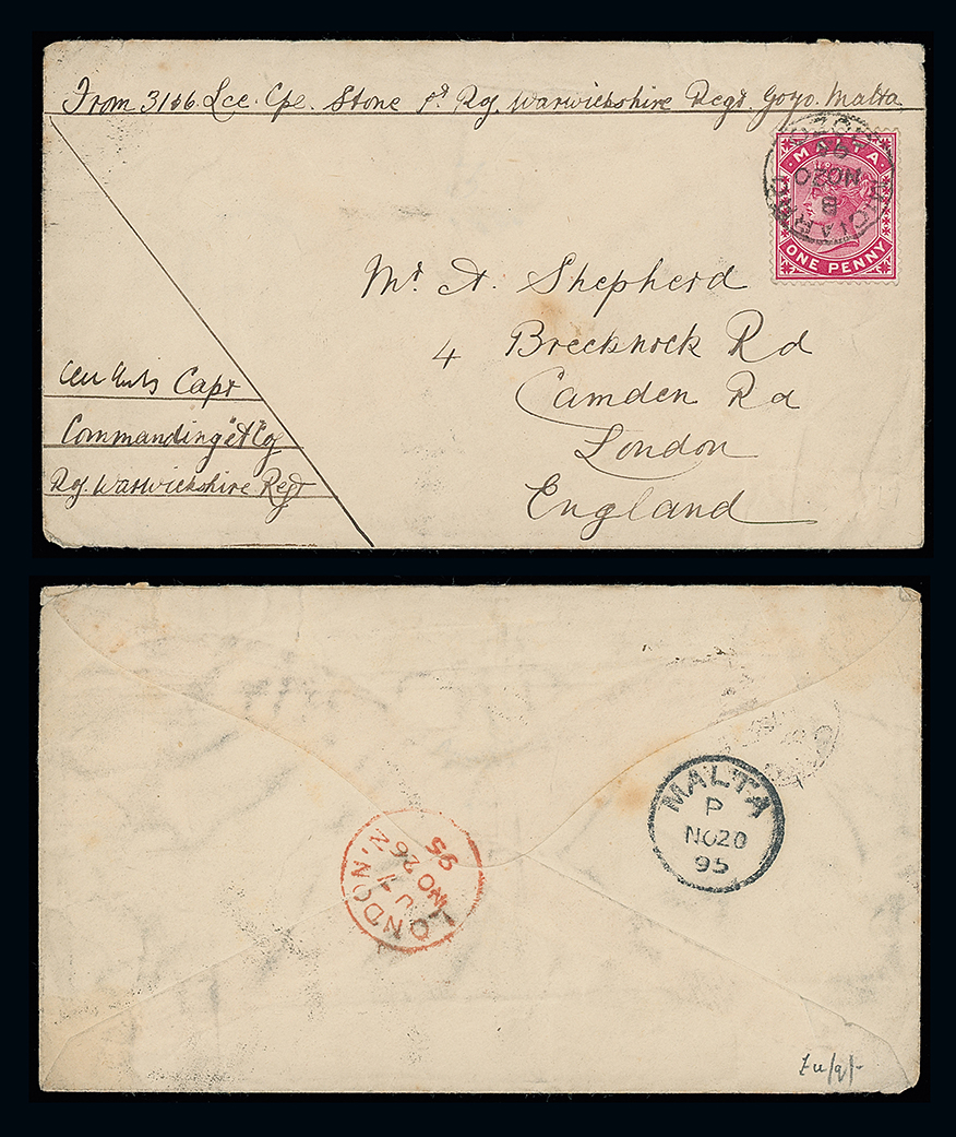 1723 c, entire, etc. imageMalta: Village Cancellations: Gozo: Migiarro: 1885 (Nov. 20) soldier’s cover to England, franked by 1d. carmine tied by “MIGIARRO/GOZO” c.d.s. (type MIG-1), manuscript “From Lce. Corpl. Stone of 1st. Royal Warwickshire, Regiment” and countersigned, rare concessionary rate from Gozo. Photo. (Image1)