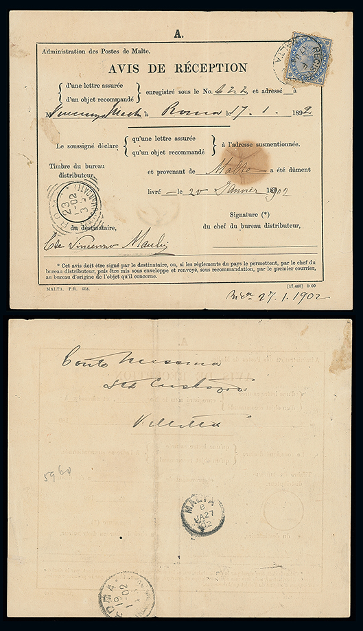 1704 c, entire, etc. imageMalta: Auxiliary Services: 1902 (Jan. 17) printed “AVIS DE RECEPTION” form to Rome franked 21/2d. (gum stained) tied by oval “REGISTERED/MALTA” datestamp and with “ROMA” squared circle, scarce. Photo. (Image1)