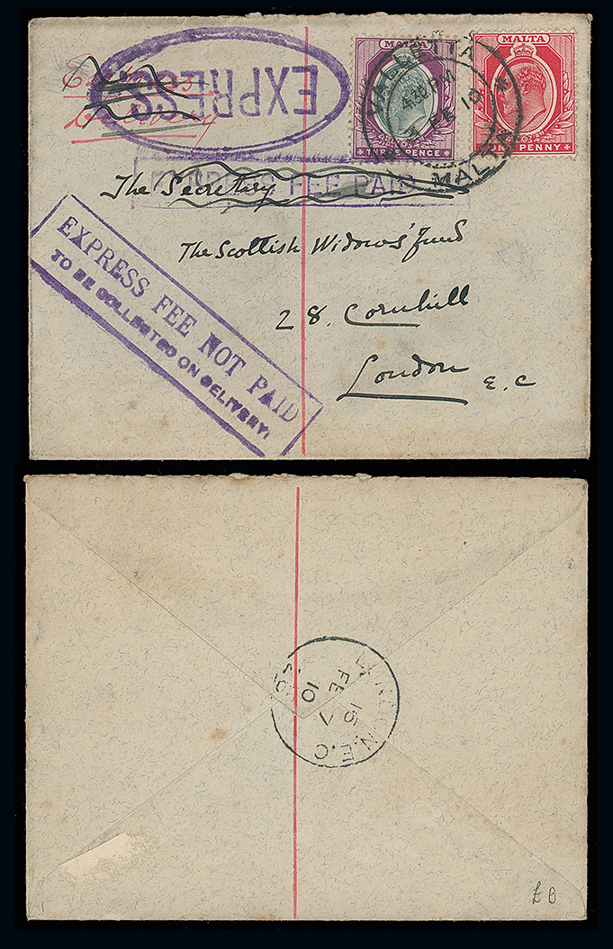 1705 c, entire, etc. imageMalta: Auxiliary Services: 1910 (Feb. 3) envelope “Express/Delivery” to London franked K.E.VII 1d. and 3d. tied by Valletta c.d.s. with oval “EXPRESS”, framed “EXPRESS FEE PAID 3D” and framed “EXPRESS FEE NOT PAID/TO BE COLLECTED ON DELIVERY” mark applied to collect the internal British fee. Exceptionally rare with no other pre W.W.II examples believed to exist. Photo. (Image1)