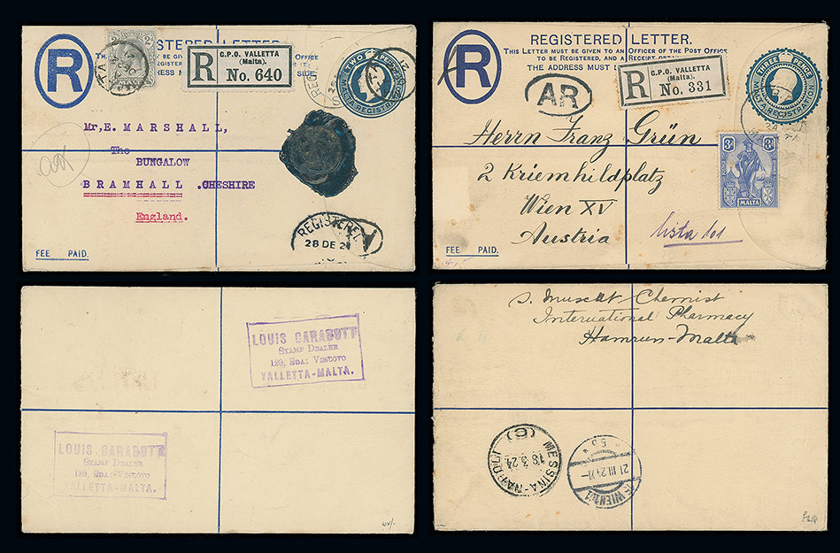 1706 c, entire, etc. imageMalta: Auxiliary Services: 1921 (Dec. 22) 2d. registration envelope to England franked 2d., 1924 (Mar. 17) 3d. registration envelope to Vienna franked 3d. both size G with Valletta registration label and oval “A.R.” mark in black. (Image1)