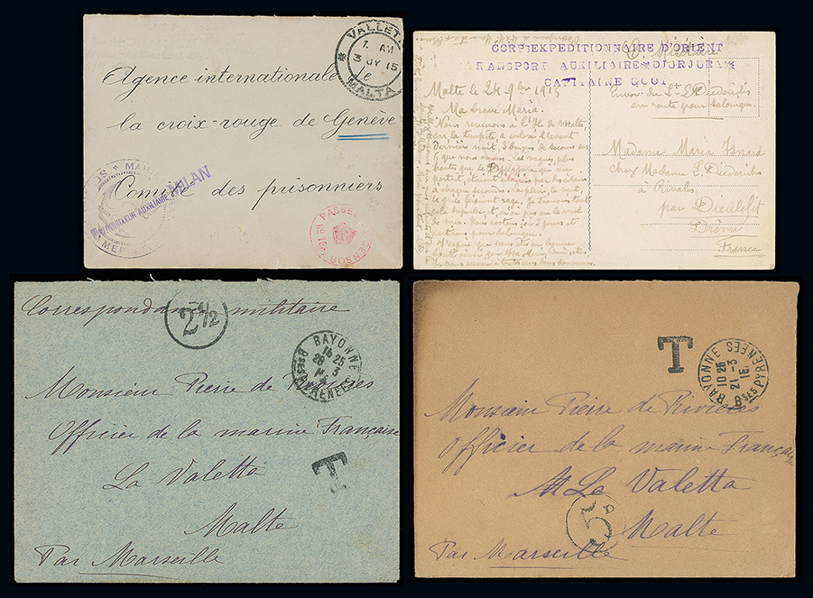 1749 c, entire, etc. imageMalta: World War I: French Navy at Malta, collection on leaves incl. 1915 (July) unfranked censored envelope to the Red Cross in Geneva with “PATROUILLEUR AUXILIAIRE MILAN” mark in blue, 1915 postcard to France with “CORPS EXPEDITIONNAIRE D’ORIENT/TRANSPORT AUXILIAIRE DU JURA/CAPTAINE GOOT” mark, 1915 (ca.) censored envelope to Valletta with “Patrouilleur/Auxiliare Venus II” (Submarine decoy) mark 1916 unfranked letters to a Lieutenant in Valletta from Bayonne with bold serif “T” marks and circular “2½D” or “5D” marks, 1916 local envelope to the ship “Torville” with serif “T” and circular “1D” marks, 1916 envelope adressed locally to an officer of the “Fantassin” franked 1d. tied by Valletta c.d.s., redirected to London, Marseille and Paris, 1916 printed O.H.M.S. Army Telegraphs and Signalling envelope to a French ensign at the Naval Hospital at Bighi, 1918 (Aug. and Sept.) unfranked envelopes to France with “POSTES-NAVAL/MEDIT.C.” c.d.s. with “1er ARMEE NAVALE/Delegation du Vice-Admiral Com’en Chef” anchor cachets on each etc. mainly very fine. (44 covers or cards) Photo. (Image1)