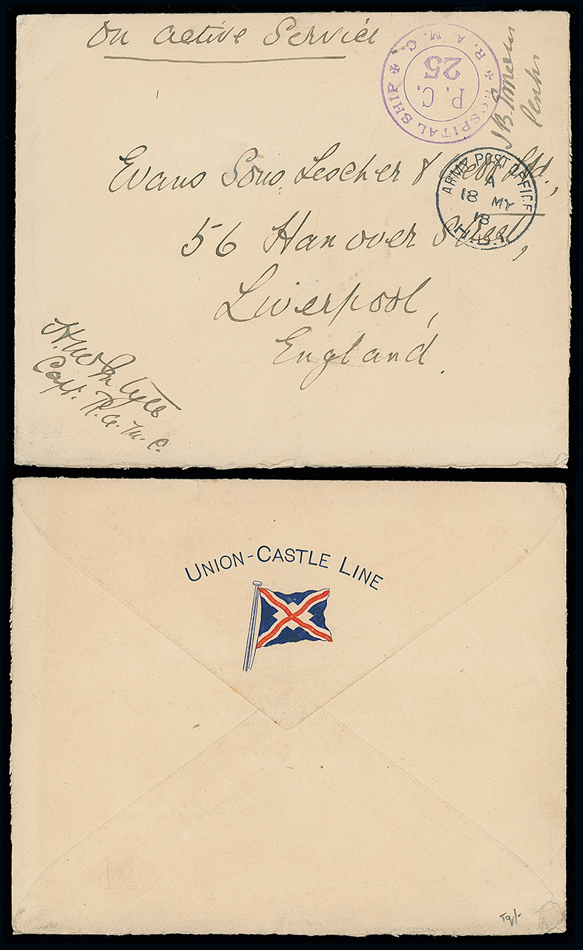 1752 c, entire, etc. imageMalta: World War I: Hospital Ships, 1915-16 used picture postcards depicting His Majesty’s Hospital Ships incl. “Dongola”, “Valdivia”, “Letitia” (with a large double oval “H.M.HOSPITAL SHIP/No..../Date.../”LETITIA”” cachet on the address side, “Braemar Castle”, “Warilda”, “Marama” (with double framed “ON ACTIVE SERVICE/N.Z.Hospital Ship/”MARAMA”” mark on address side), 1918-19 postcards or cover with double ring “HOSPITAL SHIP/P.C./3/R.A.M.C.” (believed “H.M.S GLOUCESTER CASTLE”) or “25” (identity unknown) cachets on each, two postcards or censored cover from or depicting the “FORMOSA” and a 1915 postcard to Marseille with French “HOPITAL CHIRURGICAL FLOTTANT/DU C.E.O.” mark on address side, a rare group. (13) (Image1)